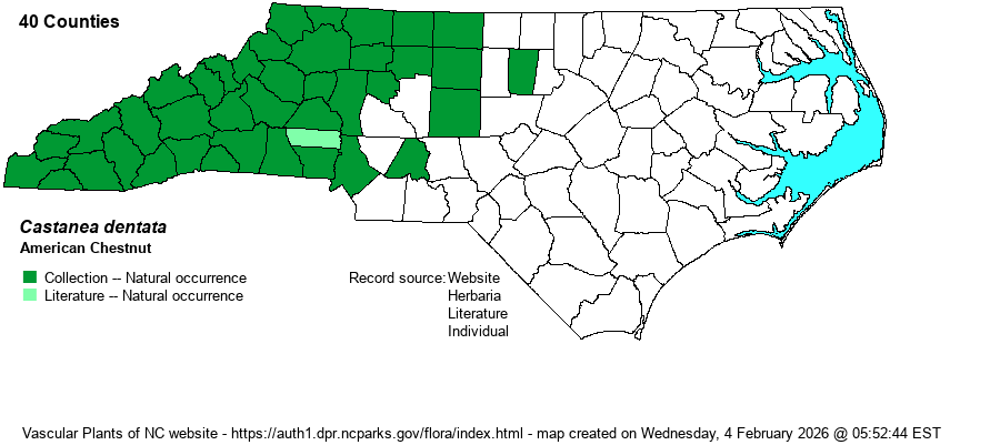 | Abundance | Formerly, before the chestnut blight hit in the 1920’s-1930’s, it was a very common and dominant montane tree. Today, it is still common in the Mountains, but only as stump sprouts and saplings; seldom reaches the age to produce fruit before dying. Fairly common in the foothills, but uncommon in the lowlands of the central Piedmont, to rare along the eastern edge. As in the Mountains, Piedmont individuals are almost only seen as stump sprouts and very young trees. In late 2022, the NCNHP added the species to its Watch List at W5, strongly declining, and they moved the State Rank up to S3 (from S4). Note that NatureServe also moved its Global Rank from G4 to now G3, indicating a continued decline. | |