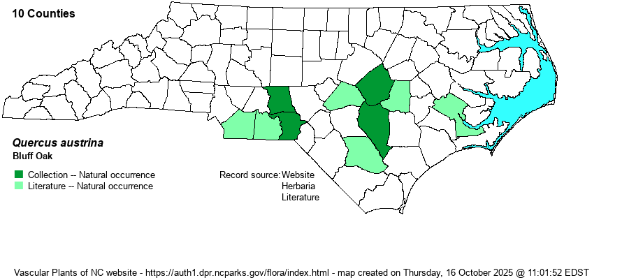 Taxonomic Comments | There has been some confusion of this species with the Bastard Oak (Q. sinuata), which is synonymous with Q. durandii. Q. sinuata occurs north only to northern SC, and thus could occur in adjacent NC. Q. austrina has also been known as “Bastard Oak”, or “Bastard White Oak”, as has been Q. sinuata/durandii, thus adding to the confusion.