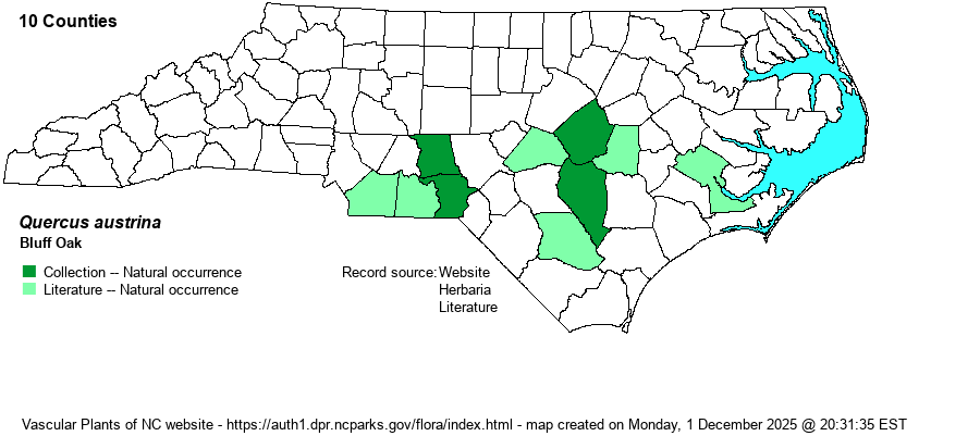 | Taxonomic Comments | There has been some confusion of this species with the Bastard Oak (Q. sinuata), which is synonymous with Q. durandii. Q. sinuata occurs north only to northern SC, and thus could occur in adjacent NC. Q. austrina has also been known as “Bastard Oak”, or “Bastard White Oak”, as has been Q. sinuata/durandii, thus adding to the confusion.