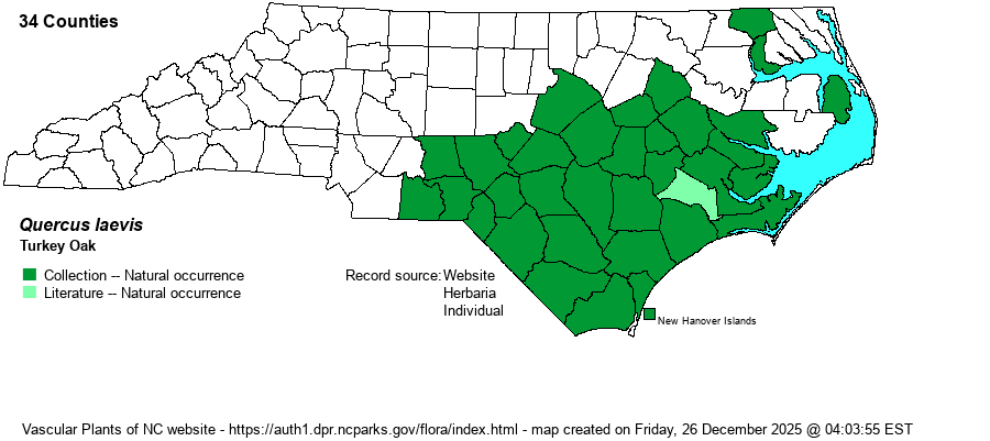 | Identification | Impossible to miss in most Coastal Plain sites with sandy soils (away from the immediate coast), this small deciduous tree grows mainly to just 45-50 feet tall. It has thick and stiff branches, and thus walking through dense stands of this tree can cause scratches on your body. The leaves resemble several other oaks with a handful of distinct lobes; the medium-sized leaves have 3-7, but often 5, lobes separated by fairly deep and rounded sinuses. They are fairly thick and shiny above, and slightly paler below. What is notable and often obvious about the leaves is that many or most on a tree have twisted petioles such that the leaf plane is perpendicular to the ground (i.e., arranged vertically). The main confusing species is Southern Red Oak (Q. falcata), which also often grows in sandy soil. However, it is a taller and more stately tree; the leaves tend to have a longer and more parallel-sided terminal lobe and stubbier and more triangular side lobes, and considerable hairiness on the undersides of the leaves. | |