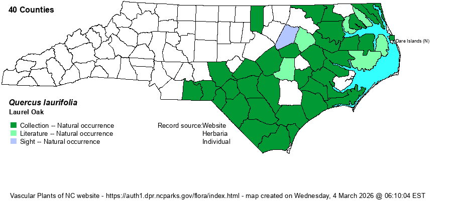 | Habitat | This is a species of swamps and bottomlands, primarily in blackwater situations, which are much more widespread in the Coastal Plain than are brownwater floodplains (mainly Roanoke, Tar, Neuse, and Cape Fear). It can grow on slight forested levees in floodplains, as well as at times in non-flowing floodplain pools. Only occasionally does it occur in maritime forests, and then only in the swampy interdunes. The very similar Darlington Oak (Q. hemisphaerica), which has often been included within Laurel Oak, grows essentially on upland soils of maritime forests and sandy flats. |