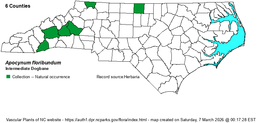 | Distribution | Scattered over parts of the Mountains, and rarely along the VA border in the Piedmont (Caswell County). This species, which is probably a hybrid or hybrid-derived species from a cross between A. cannabinum and A. androsaemifolium, is still quite poorly known, despite being listed as a species in RAB (1968) -- as A. medium. Thus, the editors feel that the range map below is likely not representative of its range or abundance in the state, though it does appear to be mainly a montane species in the state.