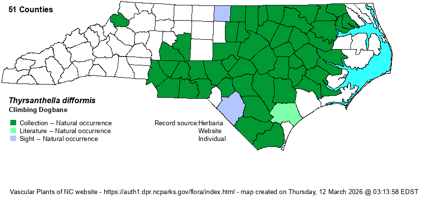 | Taxonomic Comments | This is another species that has been moved to a "new" genus in very recent times. It has or had long been named as Trachelospermum difforme, but Weakley (2018) and others have recently moved it to the genus Thyrsanthella, with a slight specific name change to difformis. Not that Thyrsanthella is easy to say, but it has "only" 13 letters and four syllables, as compared with 15 letters and five syllables in Trachelospermum!
