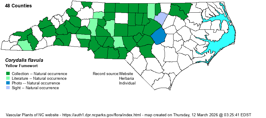 | Identification | This is a low-growing spring ephemeral wildflower, often growing in large patches. The stem is often branched near the ground and can be somewhat decumbent to erect, and it reaches only about 4 inches tall. The leaves are on long petioles and are alternate, along with basal; each blade is twice-branched, with very small, finger-like ultimate segments; each leaf is barely 3 inches long, counting the petiole. The bright yellow flowers are in short racemes of a few flowers each; each flower is horizontally facing, tubular, and about 1/3-inch long, with a spur in back. C. micrantha and C. halei are quite similar, but they have larger flowers, about 1/2-inch long, with a longer spur; they have fruits erect or ascending, whereas the fruits of C. flavula are drooping. The habitats of these are different, with C. flavula a plant of rich to moist floodplains and cove forests; C. micrantha grows in dry, rocky places, cliffs, and outcrops (over mafic or calcareous rocks), and C. halei grows only in the Coastal Plain and in sandy soil or roadsides and other clearings. C. flavula is locally numerous enough in some bottomlands that the bright yellow of the flowers is noticeable, even though each flower and each plant is quite small. As with many other low-growing native spring ephemerals, they must compete with exotics such as Microstegium vimineum and Stellaria media for valued space on the forest floor. | |