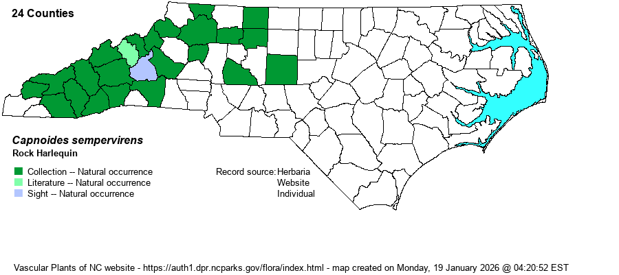 | Distribution | Present throughout the Mountains, sparingly east to the central Piedmont; ranges east to Stokes and Randolph counties.