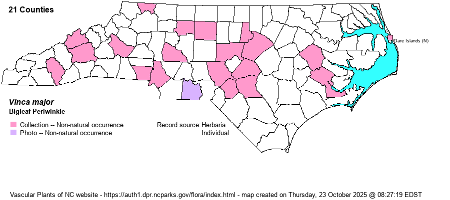 Distribution | Scattered across most of the state. Several collections are from college campuses, and it is not always clear if escaped from cultivation or merely persisting. Specimens of definitely cultivated plants were collected from Ashe, Cabarrus, Lee, Orange, and Randolph counties. First collected in NC in West Raleigh (Wake County) in 1901.