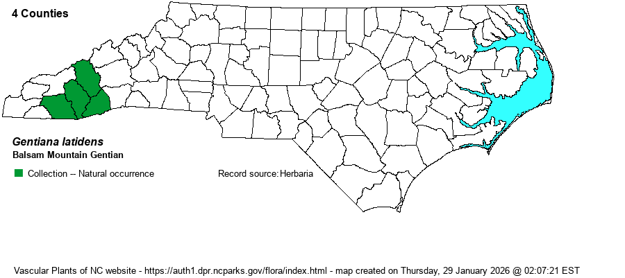 | Identification | This species is very to extremely similar to G. clausa, being a typical looking gentian of high mountains, with blue flowers and a distinctly closed corolla. Weakley (2018) gives these distinguishing characters for G. latidens: "Calyx lobes obovate, elliptic, ovate, orbicular, or rhombic, (3-) 5-25 (-35) mm; corolla lobes 2.5-5.0 mm". For G. clausa, he says "Calyx lobes widely obovate to orbicular, 2-10 mm; corolla lobes 0.7-2.0 mm". The wider range of G. clausa overlaps that of G. latidens, though a gentian growing from a vertical to steeply sloping rocky surface, with seepage, southwest of Asheville, has a good chance of being this species. It has slight corolla lobes extending beyond the pleats, whereas G. clausa has the lobes barely extending past the pleats of the corolla tube. In general, you can distinguish these two by the slightly larger flowers of G. latidens that have slightly less tight flower openings and the corolla that tapers more gradually (straighter sides) to the summit. G. clausa corollas tend to be somewhat rounded or convex and thus less "pointy". Note that two other wide-ranging montane "bottle" gentians -- G. decora and G. austromontana -- have strongly hairy stems and calyx lobes, and the first one has slightly opened corolla tips. | |