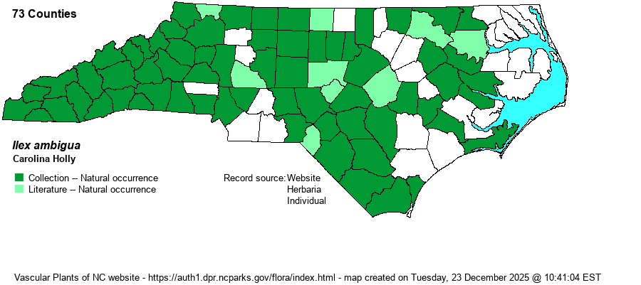 | Distribution | This species ranges across most of NC, except seems to be absent from the eastern Coastal Plain (i.e., no records yet for north or south of Albemarle and Pamlico sounds). Note that this is a different taxon than the I. ambigua as shown in RAB (1968). Most of the range east of the Mountains as shown on the I. ambigua var. montana map in that reference is actually that for the newly defined I. ambigua. However, things are still unsettled, as what is now being called as this "new" I. ambigua still seems to include at least two different taxa/species -- one with smaller, narrower, and more obviously serrated leaves (as in the photo below), and a second with a bit larger and obviously more widely elliptic (almost rotund) leaves. These smaller and narrower leaves seem to be found on plants more in the Coastal Plain and southeastern Piedmont, and the more rounded leaves more so in upland Piedmont forests.