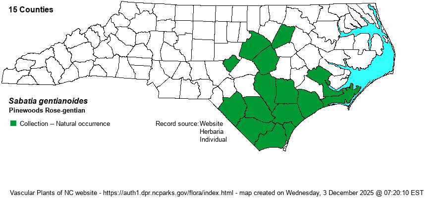 | Identification | This may be the brightest and richest rose-colored flower you can find in NC savannas, one of the state's most beautiful wildflowers. It has an erect stem to about 1.5-2 feet tall, with either an unbranched stem or with only a very few small and erect branches. Basal leaves may be present at flowering, and these are fairly wide, but the paired stem leaves are linear, about 3-4 inches long but barely 1/8-inch wide. The large flowers that top the stem and any branches are almost sessile, with very short pedicels; if more than one flower is present at a branch or stem tip, they are in a compact cluster. Each flower has a bright to deep rose color, rarely "just pink", with a yellow base, about 10 (to rarely 12) petals in all, and the spread flower is about 2 inches across. The only species to potentially confuse with it -- S. dodecandra and S. kennedyana -- have solitary flowers (one per branch or stem) on fairly long pedicels, well above the stem and branches. Also, these occur in different habitats -- the former in tidal marshes, and the latter in Waccamaw River floodplain wetlands, whereas S. gentianoides occurs in savannas. S. kennedyana and S. gentianoides could potentially occur in close proximity, but the first one has single flowers on long pedicels, whereas the latter has sessile flowers, often 2-5 in a tight cluster. | |