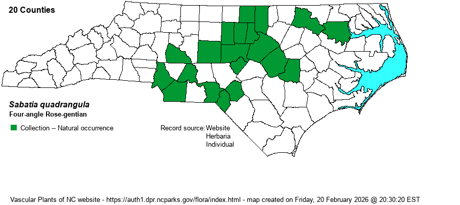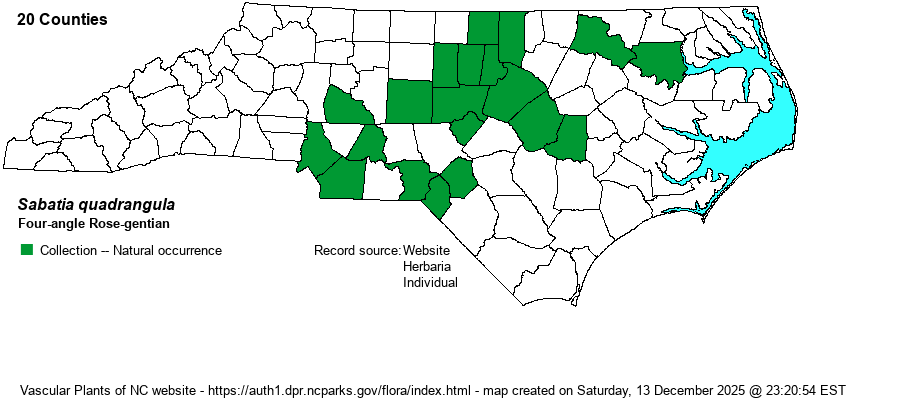 | Identification | This is a poorly known species to most biologists, even though it occurs near the highest population centers in the state. It is a small and slender Sabatia, growing erect to only about 12-15 inches tall, with a distinctly square stem, hence the "quadrangula" in the name. The several pairs of opposite leaves are narrow, generally linear, about 1.5 inches long and only about 1/5-inch wide, and not thick or fleshy as in S. difformis, which also has a rather rounded stem. There are several short, opposite branches, at the ends of which grow one to several flowers on moderate pedicels. Each flower has 5 white petals, but each flower is only about 4/5-inch across, about the size of a penny or dime, as opposed to the quarter-sized flowers of S. difformis. Each does have a rather flat-topped inflorescence, but even so, when you see S. quadrangula in bloom, at much distance it looks somewhat like a whitetop aster (Sericocarpus spp.). But, if you bend down and take a closer look, you can see the yellow spots at the base of the petals that nearly all Sabatia species have. This is a difficult species to find, best done by walking powerline clearings in the lower Piedmont, especially where there are flat areas; it often is found in quite diverse places with much forb or grass diversity. | |