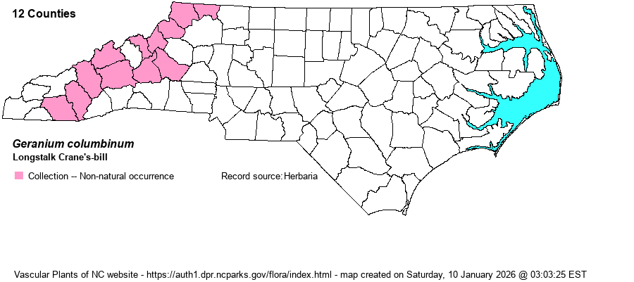 | Identification | The leaf blades of this species grow on long to very long stalks, form a rounded outline, and are deeply dissected into narrow segments. The flowers grow from leaf axils on long stalks, are usually paired, purplish pink. Sepals have a short awn or mucro at the tip (contra those of G. molle). Pedicels are more than 2 times the length of the sepals, versus less than 1.5 times in G. carolinianum and G. dissectum. | |