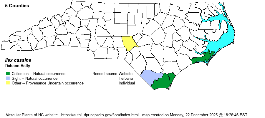 | Distribution | Strictly in the southeastern part of the state, known only from Carteret, Columbus, Brunswick, and New Hanover counties. Also photographed by Alan Weakley in Moore County; out of natural range and treated here as provenance uncertain. There are a number of "hidden" specimen sheets on SERNEC for "I. cassine" from Coastal Plain counties farther inland or northward than shown on the map. Whether these refer to I. myrtifolia or I. cassine is not known; in addition, these could represent planted or escaped individuals. The species has truly been confirmed as wild just from Carteret to Columbus counties.