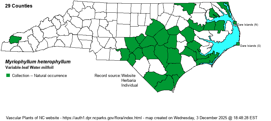 | Abundance | Frequent to common in the Coastal Plain; exceedingly rare westward. Often abundant where found; plants may choke waterways or cover surfaces of small impoundments. More widespread in the Sandhills than elsewhere in the Coastal Plain. | |