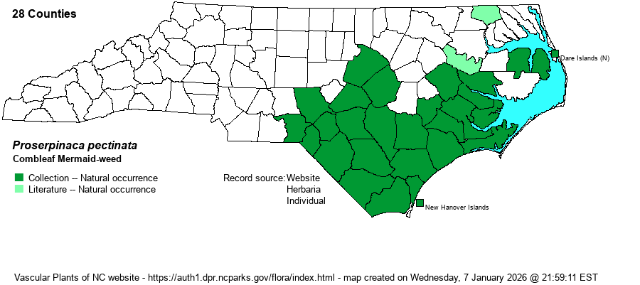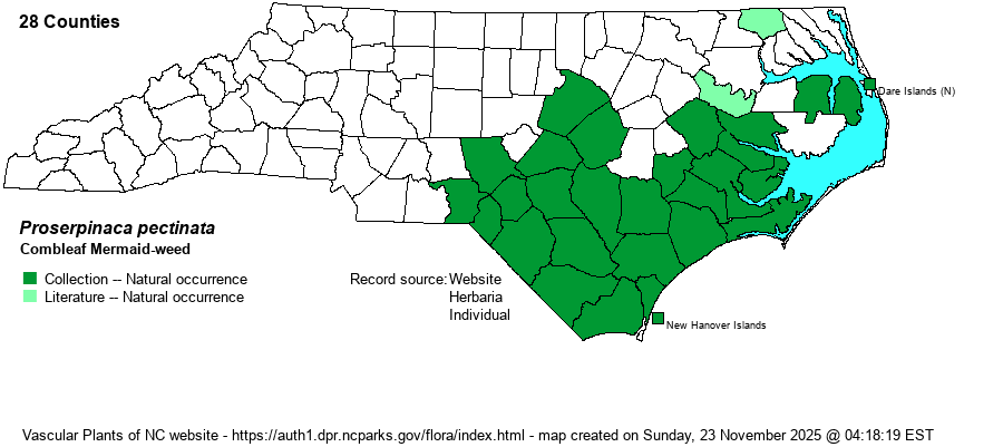 | Identification | Combleaf Mermaid-weed grows like Marsh Mermaid-weed (P. palustris), sprawling and sending up flowering shoots of tiny flowers and greenish white capsules. It differs in having all leaves finely dissected, not just the lower ones. In fact, the emergent leaves do look quite a bit like a comb, hence the common name. Both species are reasonably common over much to most of the Coastal Plain, with many bodies of still water of pools and ponds containing at least one of these species. | |