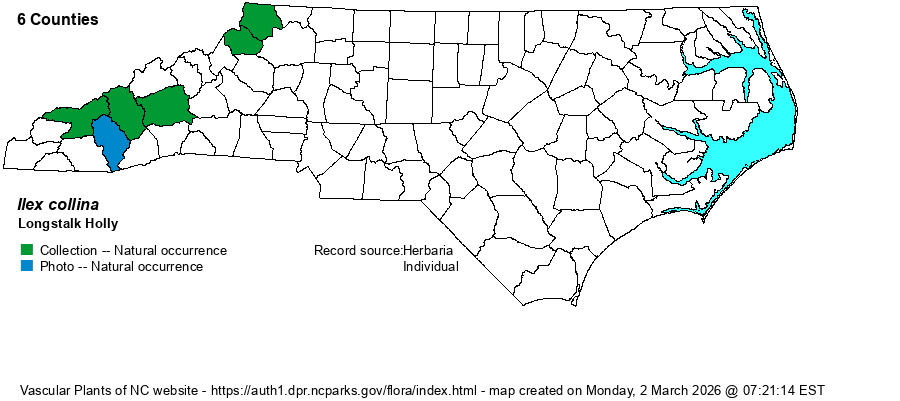 | Taxonomic Comments | There has been confusion about this species in the past. It was not included in RAB (1968), either owing to not yet having been found in NC at that time, but also to confusion of this species with the formerly named Nemopanthus mucronatus, which is now named as Ilex mucronata. That species is similar, but occurs south only to MD and WV and has somewhat different characters. Ilex collina was formerly known as Nemopanthus collinus, as well.