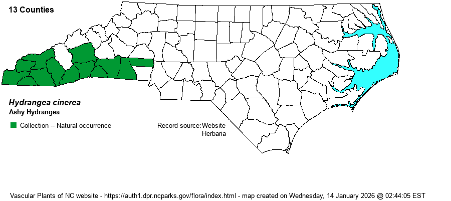 | Abundance | Rare to uncommon in its fairly small range in the state. This is the only one of the three Hydrangea species in the state that is scarce enough to be on the NC NHP Watch List. | |