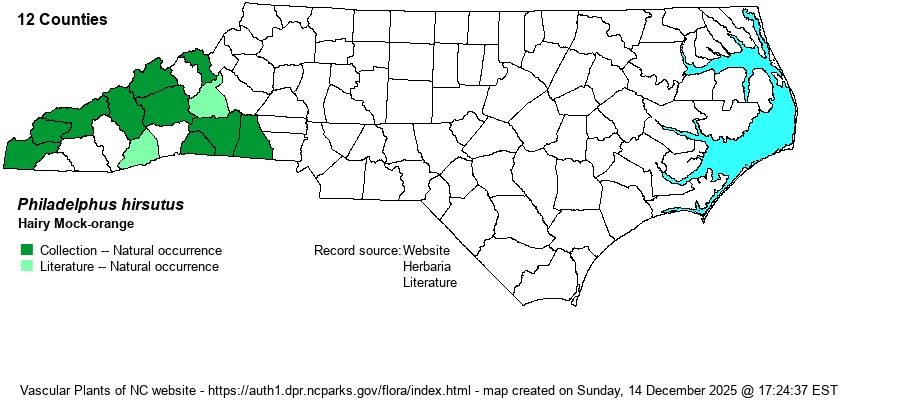 | Identification | This is a fairly small to medium deciduous shrub that grows to 3-5 feet tall. It has opposite ovate leaves with clearly toothed margins (except near the base) and a strongly curving side vein on each side of the mid-vein, which gives the two Philadelphus species a distinct look. The leaves reach about 2-2.5 inches long. This species has densely whitish to pale gray hairs on the lower side of the leaves, as well as hairy twigs, which give it a grayish/glaucous look at a distance and should help separate it from the other mock-orange, which may grow with it at some sites. Both species have large and beautiful white flowers, consisting of four petals, growing in small clusters at the branch tips; in this species, the open flower averages about 1-inch across, clearly smaller than P. inodorus. Hairy Mock-orange tends to bloom a week or more earlier than does its counterpart in the same region of the state. | |