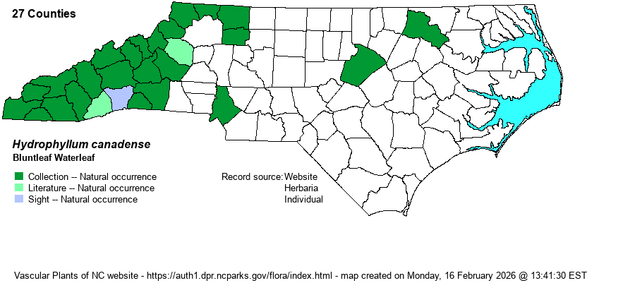 | Identification | This is a rather robust herb despite growing only to 1-1.5 feet tall, with somewhat pubescent stems and leaves. It has several alternate, hispid leaves, each leaf on a very long petiole of several inches. Each leaf is quite large and maple-like, with 5-9 shallowly to moderately cut lobes, reaching 5-6 inches across and wide, and strongly serrated on the margins. From an upper leaf axil or two grow the relatively small cymes of 5-10 bell-shaped flowers, each flower being about 1/2-inch long and across the mouth, white to pale purplish-white. These small clusters are held below the tops of the leaves and do not attract as much attention as do the large maple-like leaves. The other two or three Hydrophyllum species in the state can grow with it or near it, but they have leaves that are more deeply dissected into longer lobes, and the general shape of these leaves is longer than wide. This is a reasonably easy species to find in some of the rich coves in the mountains, though your timing may only catch the large leaves and not the flowers in bloom. | |