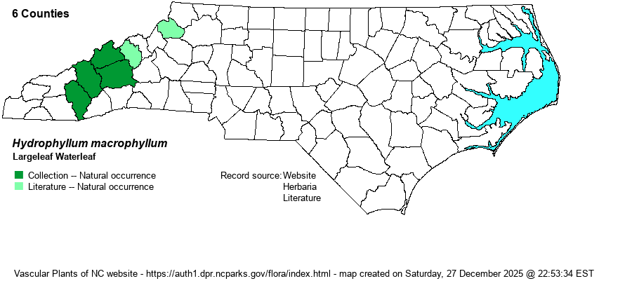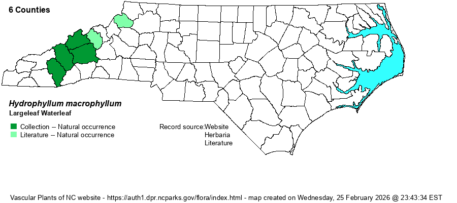 | Distribution | Found strictly in the Mountains, and mainly restricted to the central portion, from Yancey south to Jackson counties. Also reported from Watauga County. It almost certainly occurs in other montane counties.