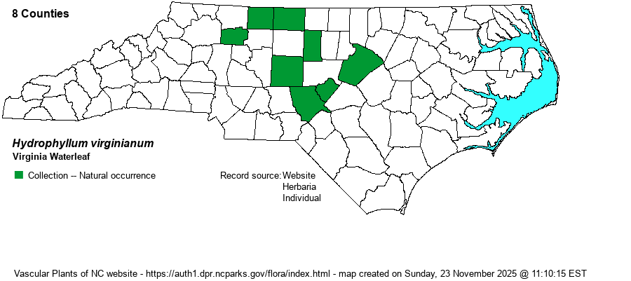 | Identification | This is an erect species with several branches and fairly long leaves, making it appear as wide as tall; it can range to 1.5-2 feet tall. It has a few alternate stem leaves, each about 4 inches long and half as wide, but deeply cut into 5-7 lobes, with serrated margins. The upper surface usually contains some small pale blotches, the tell-tale "waterleaf" mark, if present. Each plant has a few ball-like clusters of flowers, on quite long stalks about 4-6 inches tall, lifting the flowers above the leaves. The flowers are bell-shaped, nearly 1/2-inch long and are white to very pale lavender in color; the very similar H. atranthum of the Mountains has rich violet flowers. H. canadense may grow in the same habitats and sites, but that species has broad leaves with less deeply cut sinuses and thus leaves looking more like a maple leaf. | |
