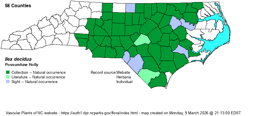 | Other Common Name(s) | Deciduous Holly, Possum-haw. Note: “Possum-haw”, “Possumhaw”, or “Possum Haw” is the most frequently used name. However, other shrubs or small trees are also called “haw”, including several Viburnum species; in fact, V. nudum is often called Possumhaw Viburnum, as is done on this website. Thus, it is important to avoid confusion and add “Holly” after “Possumhaw” for Ilex decidua, as some websites and references do, including this one. | |