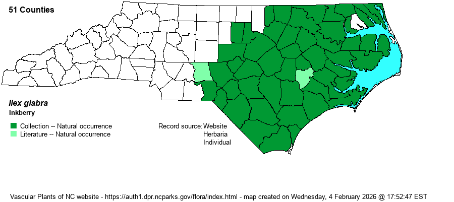 | Habitat | This is a species of acidic wetlands, though it is not as tied to pocosins as is Ilex coriacea. It is widespread in pine flatwoods, savannas (at least fire-suppressed ones), streamhead ecotones, margins of larger pocosins and bays, and even into more mesic pine woods, especially near seeps or hardpans where there is some moisture just below the surface. In the Piedmont it can occur in bottomlands or damp to mesic pinewoods. |