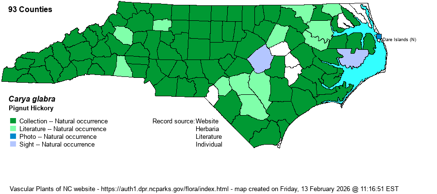 | Taxonomic Comments | Some references have this species split out into varieties. Red Hickory has often been considered as a variety – C. glabra var. ovalis, but most recent references, even RAB (1968), consider it as a good species. NatureServe lists not only the nominate variety but also var. hirsuta as occurring in the state. Weakley (2018) does not list varieties.