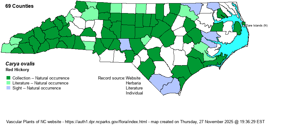 | Distribution | Essentially statewide, but as this is a difficult species to identify for many biologists, it has been much less collected for documentation than have Pignut (C. glabra) and Mockernut (C. tomentosa) hickories. Perhaps occurs in nearly all 100 counties, but possibly absent in some far eastern counties and the Sandhills proper. Sizable "holes" in the range elsewhere, such as the northwestern Piedmont and south-central Coastal Plain, are probably not real.