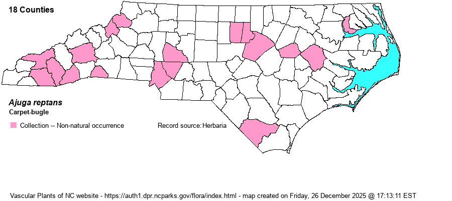 | Identification | Carpet-bugle is an old garden favorite. The plants are perennial from surficial stolons that have pairs of ovate leaves. A central, leafy stem grows erect with a terminal, dense inflorescence, altogether only 4-10 inches tall, with blue or violet flowers. Nothing else looks quite like it, though an inexperienced person might try to turn the very common Ground-ivy (Glechoma reptans) into this species, as they have similar flowers (but not inflorescences). | |