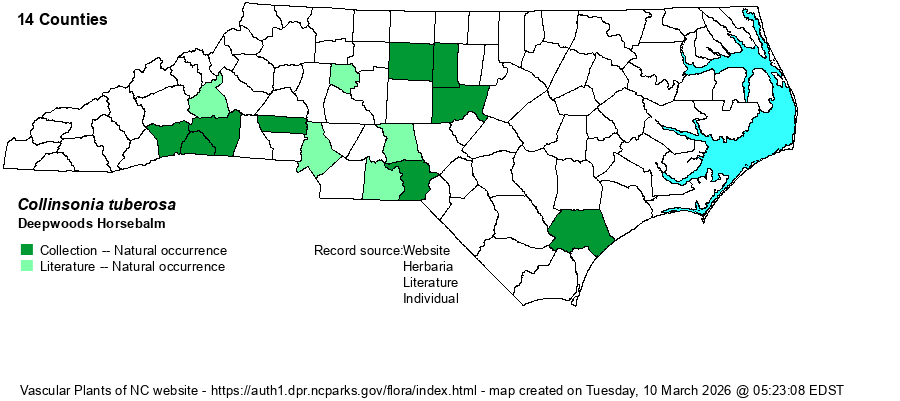 | Identification | This is a medium-sized herb, shorter and less robust than the similar C. canadensis, to which it needs to be carefully compared with. Leaves of C. tuberosa are distinctly smaller than those of other Collinsonia species in our state, and the stem and inflorescence branches are more slender. This species is mostly unbranched, growing to about 2 feet tall, with a few pairs of opposite leaves on quite long petioles. Note that the petioles in C. tuberosa are at least half as long as the blade; that is, the petiole averages nearly 2 inches long, and the ovate to elliptic blade is only about 3 inches long and 2 inches wide, with serrated margins. The terminal panicle of scattered flowers in a pyramid shape is about 4-6 inches long, but in this species the flowers are white to cream in color, paler than the canary yellow in C. canadensis. Note that both species can theoretically grow in the same area on the same slope, and bloom at the same time; but this species is quite rare and extremely difficult to find without knowing where to look. Experienced biologists can probably identify the species just in vegetative condition, owing to the long petiole that is generally more than half as long as the length of the blade. In fact, very few people have seen the species in bloom in NC. | |