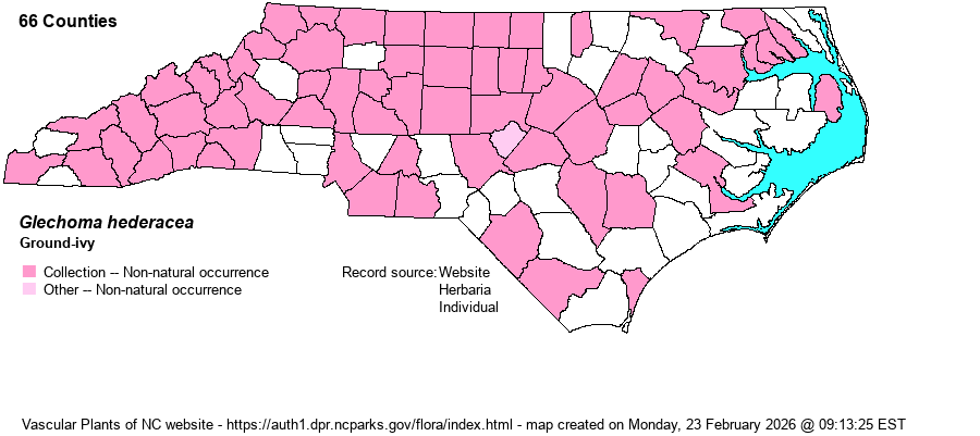 | Abundance | Common in the Piedmont, Mountains, and much of the western and central Coastal Plain; scarce in the Sandhills and lower Coastal Plain. This can be a serious pest species in bottomlands and other rich hardwood forests, where it can impact low-growing native spring wildflowers. | |