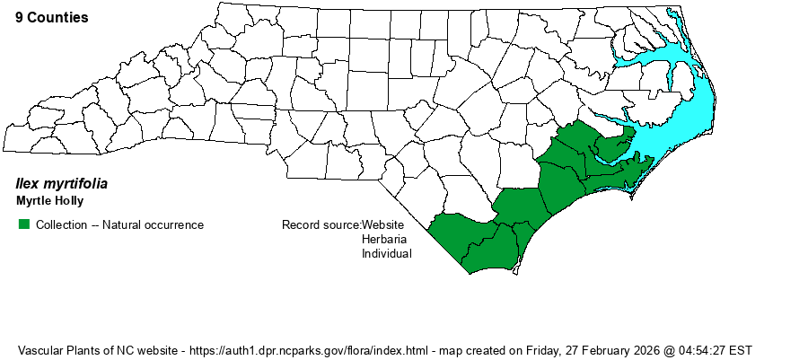 | Taxonomic Comments | Until recent decades this taxon was generally considered as a part of I. cassine, and named as I. cassine var. myrtifolia. However, nearly all recent references consider this a valid, good species.