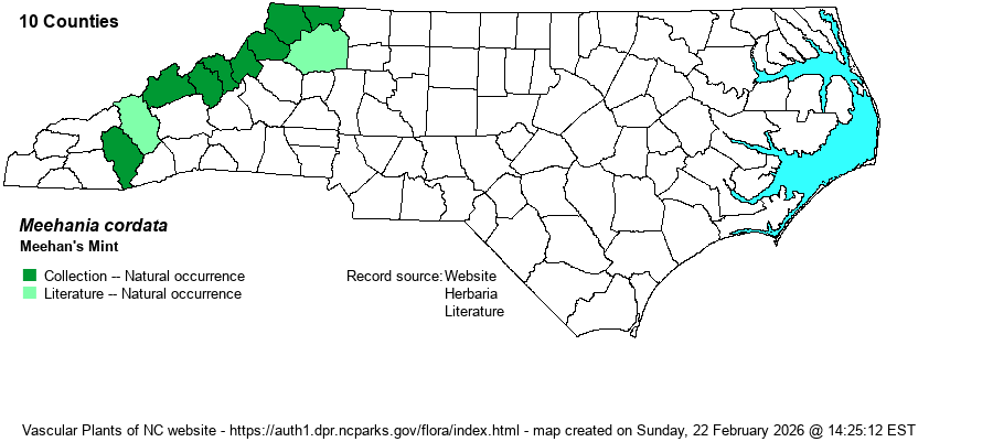| Identification | This is an odd mint, completely unlike any other flowering plant in the state. It is somewhat leaning and trailing and can form carpets. Plants can be only about 6 inches tall but often 1 foot wide or more, with a few pairs of opposite leaves on quite long petioles (about 2 inches long). Each leaf blade is quite violet-like, being ovate with a cordate base, scalloped margins and a rounded tip, about 1.5-2 inches long and wide. At the ends of the one to several branches grow the small clusters of flowers, each flower being about 1.3-1.5 inches long (large for the size of the plant), mostly lavender-blue in color. They are erect to leaning, with a tubular lower portion and a curved hood over the opening. As the species tends to grow in carpets low to the ground, a patch of the plants in full bloom is quite striking and unforgettable. Even just in leaf, the colony can be identified by experienced biologists, but inexperienced ones would likely call the plants as violets, or worse, as the exotic Ground-ivy (Glechoma hederacea). Exploring the mountains of Ashe and Watauga counties may well yield some of the plants, though they bloom after the main spring wildflower push in mid-April to mid-May; they do not normally start flowering until later in May. | |
