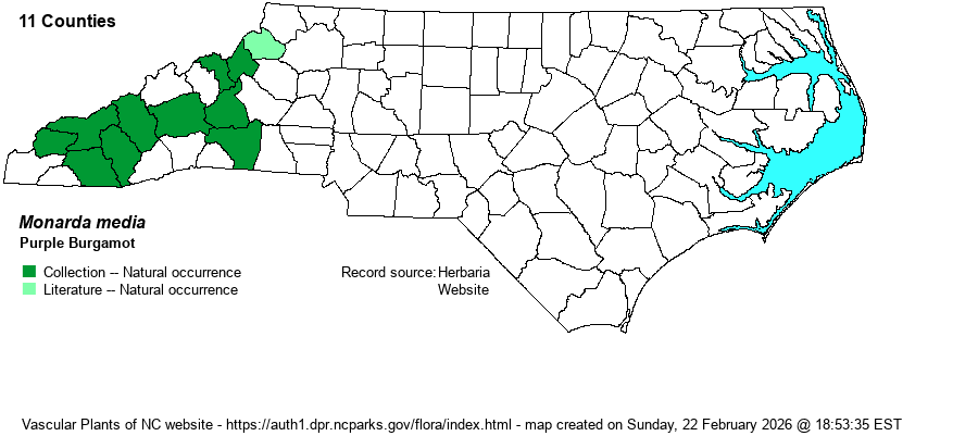 | Distribution | Restricted to the Mountains, and essentially only (or primarily) at high elevations. NCU and other herbaria contain specimens from Mitchell, Davidson, and Rutherford counties, among a few others into the Piedmont and Coastal Plain; these are perhaps taken from dubiously non-natural sites. Quite a few collections and photos of Monarda species are assumed to be from planted locations outside the expected ranges.