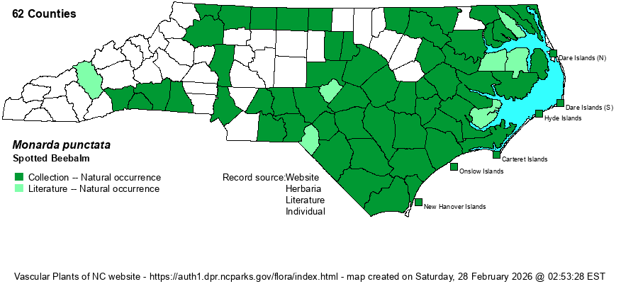 | Taxonomic Comments | This species has quite a few varieties, according to most recent references, no surprise considering its wide range. Weakley (2018) lists three varieties in the state --- the very rare montane var. arkansana, the widespread var. punctata, and var. villicaulis, considered by him as likely not native to the state (in the Coastal Plain).