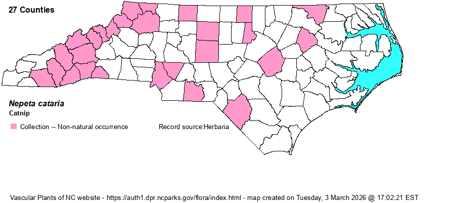 | Identification | Catnip stems are usually much branched and 2-3 feet tall. The leaves are noticeably triangular in shape (the base the shortest side), with marginal teeth. The plant is essentially covered with very short, dense, fine pubescence. The flowers are white, the lower lobe dotted with purple; they grow from axils and terminally in dense to loose clusters. | |