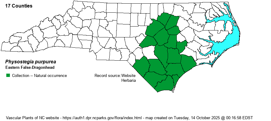 Distribution | Present in the central and southern portions of the Coastal Plain, and adjacent eastern edge of the Piedmont (Franklin, Nash, and Wake counties). It is absent from the northeastern half of the province (and in VA), with no records northeast of Nash, Wilson, Lenoir, and Onslow counties. Also, it is absent from the Sandhills proper.