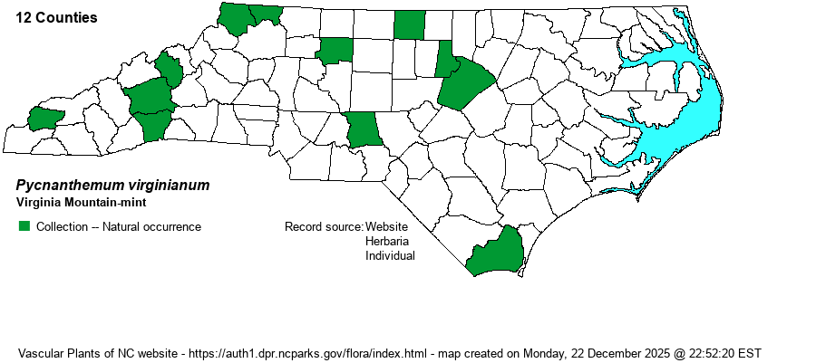 | Identification | This is one of the several narrow-leaved mountain-mints in the state, and owing to its rarity, must be carefully separated from the quite common P. tenuifolium, and less so from P. flexuosum. It grows to about 2.5 feet tall, with branches in the upper portions, as with most others in the genus. In this species, the stem is strongly 4-sided, with hairs on the edges and at times on the sides; P. tenuifolium is glabrous and often has a somewhat rounded stem. The very numerous pairs of opposite leaves average about 2 inches long and about 1/4-inch wide (3-10 mm), whereas those of P. tenuifolium are generally 1/8-inch (3 mm at best) wide or narrower. Otherwise, it has numerous small heads at the tops of the upper branches, each with a group of small white flowers; the clusters are more unevenly spaced on the plant and not anywhere resembling a flat-topped look as often seen in P. tenuifolium; in addition, the flowers are slightly larger than in that species, creating more of a spectacle when a group is in bloom. P. flexuosum is a whitish-looking plant, with an abundance of white hairs over the plant. This rare species is difficult to find in NC, though as it can be passed over as P. tenuifolium and has a wide range in the state, there seems to be plenty of opportunity for new populations to be found in the mountains and northern Piedmont. | |