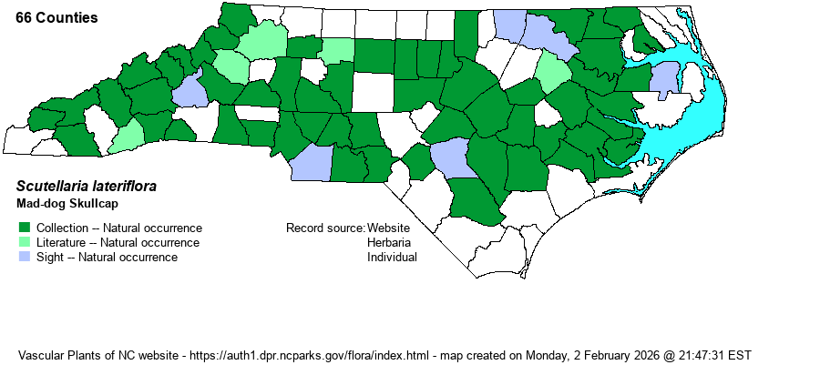 | Phenology | A fairly late-blooming Scutellaria, from July to frost, and fruits soon after flowering. | |