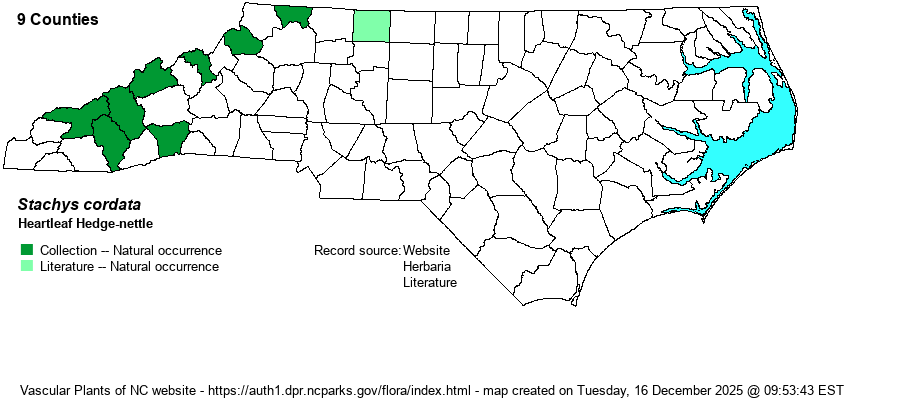 | Identification | This Stachys probably has the largest or at least the widest leaves in the genus in NC, with them being widely ovate, with a clearly cordate base; the leaf tip is somewhat rounded and is not acute. Also, the teeth are rounded, as in S. nuttallii. That species is quite similar, but its leaves are more elliptic-oblong and with an acute tip, and the base is rounded to only very slightly cordate. Lastly, this species has longer petioles than found on S. nuttallii; this species has them about 2/5-inch long or more, whereas that of S. nuttallii is typically less than 1/5-inch long. As both occur in the lower elevations of the mountains, in moist to rich soil, you have to be very careful with your identification of these. | |