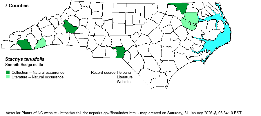 | Distribution | Widely present in the state, to an undetermined extent, owing to difficulty in identification of specimens, much less sightings. Distribution is not at all clear; mostly found along the Roanoke River in Bertie, Martin, and Northampton counties. SERNEC lists many montane counties for this species, in addition to a few other downstate; however, most seem to refer to other Stachys species, and the authors limit the collection records on the map essentially to NCU specimens. NOTE: All specimens need updated annotating, because records of tenuifolia used to include latidens, hispida, and aspera.
