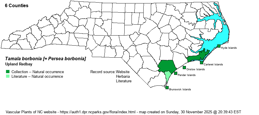 | Taxonomic Comments | A paper in 2020 by Song et al. has moved the Persea species to the genus Tamala, which is followed by Weakley (2022). This species has generally been lumped within P. palustris until fairly recently. Interestingly, that single species was often named as P. borbonia, such as by RAB (1968). Thankfully, essentially all recent references list both species, with P. palustris being the typical and more familiar species, occurring throughout much of the Atlantic and Gulf Coastal Plains, leaving P. borbonia