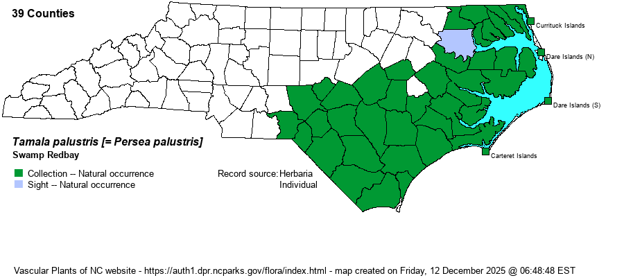 | Taxonomic Comments | A paper in 2020 by Song et al. has moved the Persea species to the genus Tamala, which is followed by Weakley (2022). Though there are no issues with this being a good species, until fairly recently it was lumped within the closely related P. borbonia, this being the oldest name. Older references often named this entire species as P. borbonia, as in RAB (1968).