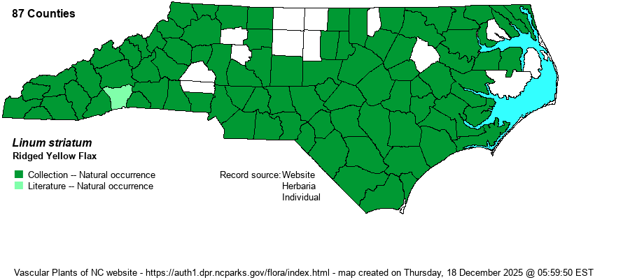 | Identification | The Linum species are quite difficult to identify, especially as many of the former varieties and subspecies have now been elevated to full species. All are erect herbs to 1-2 feet tall, with slender branches that are usually ascending, small and narrow leaves, and numerous scattered small yellow flowers (with 5 petals) along the upper portions of the branches. L. striatum is the most distinctive of the NC species, as it has opposite or mostly opposite leaves, which are wider than in other species. The leaves are narrowly elliptical, as opposed to linear, and are about 1/5-inch wide, as opposed to 1/8-1/10-inch wide or less. Also, this species has ridged stems, as opposed to rounded. Lastly, this species has a paniculate inflorescence, whereas others are more corymbose; that is, there are short lower branches that contain some flowers, such that not all flowers are on branches that are somewhat equal in height from the ground (and yielding a flat-topped inflorescence). | |