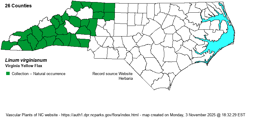 | Taxonomic Comments | Though L. virginianum has always been a named species, older references typically included one or more current species within it. As a result, many specimens labelled as "Linum virginianum" might not now be correct to the species as named in Weakley (2018).