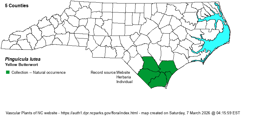 | Abundance | More strongly declining than the other two butterworts (Pinguicula); formerly uncommon, but now very rare to rare, except locally numerous in eastern Pender County. The NCNHP has moved its State Rank upward to now S1 (critically imperiled). Its State Status was upgraded to State Special Concern in May 2021. | |