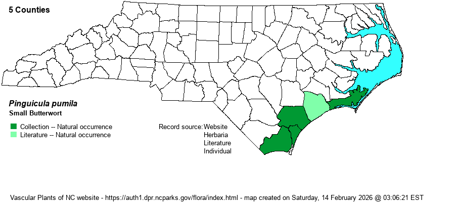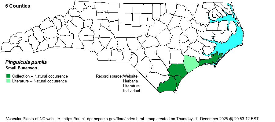 | Distribution | Restricted in the Coastal Plain only to counties along the Atlantic Coast, from Carteret to Brunswick (a total of five counties). A specimen at UNCC (20353) needs to examined, as without a flower the specimen could simply be a runt individual of another butterwort species. Unlike the other two butterworts, it has not been found in counties inward from coastal counties (unless the Bladen one is confirmed).
