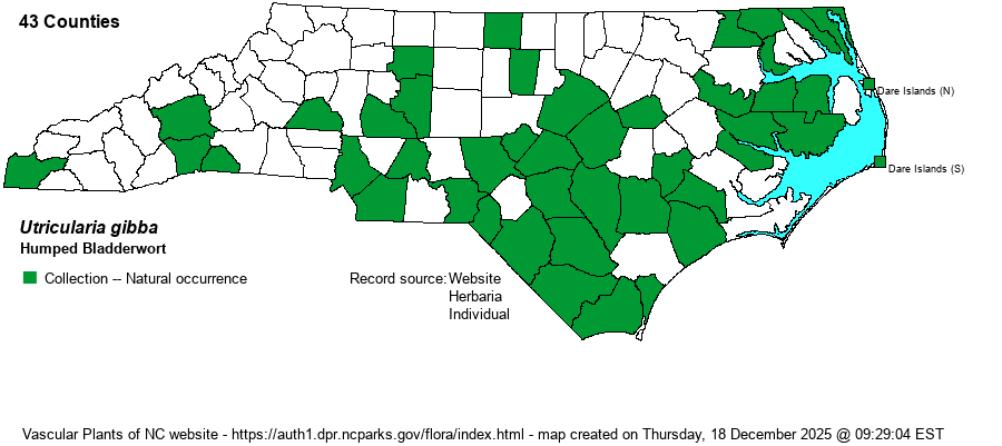 | Distribution | Scattered over much of the Coastal Plain, the Piedmont, and edge of the Mountains (Cherokee, Henderson, and Buncombe counties). This is a tiny species and is easily confused with U. biflora. One of the website editors (Sorrie) has examined the specimens at NCU and concurs with the ID of specimens from Brunswick, Currituck, Gates, Harnett, Henderson, Hertford, Mecklenburg, Tyrrell, and Washington counties. Outer Banks (Dare County) specimens are at herbarium NCSC. In 2022, Sorrie confirmed the following Piedmont counties: Caswell, Cherokee, Davidson, Forsyth, Henderson, Mecklenburg, Rowan, Stanly, Union, Wake (Polk and Buncombe counties records were without image). Weakley's (2024) map shows it as widespread and numerous across the state, and the VA atlas map shows it as widespread across the eastern half of that state.