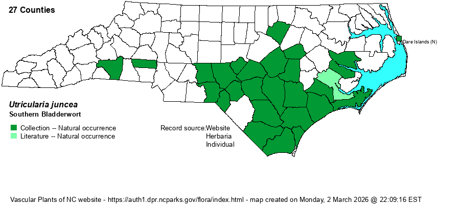 | Identification | As with U. cornuta, the identification is from the stem and flowers and not the small leaves at the base of the flowering stem. The stem grows to about 7-8 inches tall, is purplish-green, and contains numerous bright yellow flowers arranged rather scattered up and down the upper part of the stalk. Each flower is about 1/2-inch long/across, with a long downward curving spur that seems to "tilt" the flower somewhat upward. Only U. cornuta has a similar flower, but that species has larger flowers that may trend to a more golden color (but can also be bright yellow), a taller stem to about 10 inches tall, a stem that is yellow-green, and the flowers growing closer together and not as scattered (as in U. juncea). Fortunately for the biologist, he or she can often run into U. juncea when looking around the margins of pools and pond margins, such as margins of limesink ponds and clay-based Carolina bays. | |