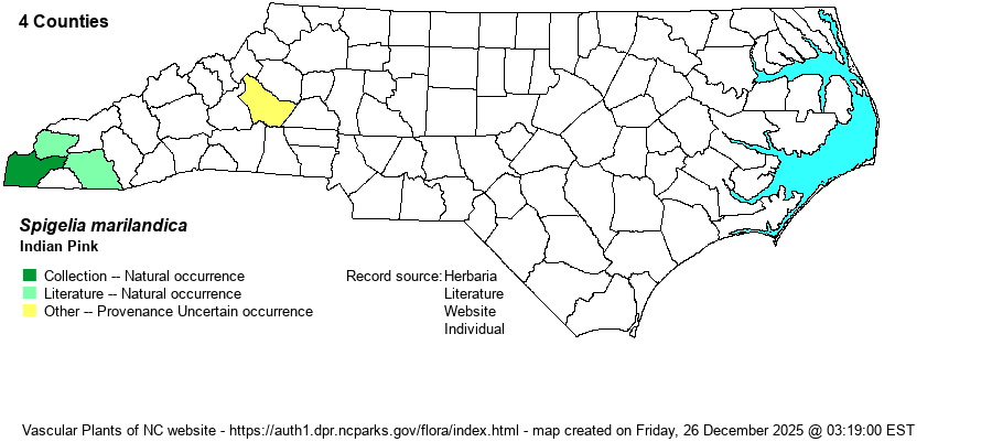 | Distribution | Known as native only for the extreme southwestern counties in the Mountains, near the GA and TN borders. A photo report of a few plants in South Mountains State Park (Burke County) in June 2021 is hereby placed in the Provenance Uncertain category, as it is well to the east-northeast of other records. NCNHP has five records for Cherokee County, and Weakley (2018) also mentions Macon County. A photo from Graham County on iNaturalist seems plausible at a natural site. First discovered by David Danley and Gary Kauffman on the E side of Lake Hiwassee, in Cherokee County on 2 July 1999 (specimen at WCU). SERNEC specimens from farther eastward into the Piedmont are clearly not natural occurrences, and the many iNaturalist photos from across the Mountains and Piedmont likewise have to be dismissed as plantings, escapes, or otherwise not documented as wild plants.